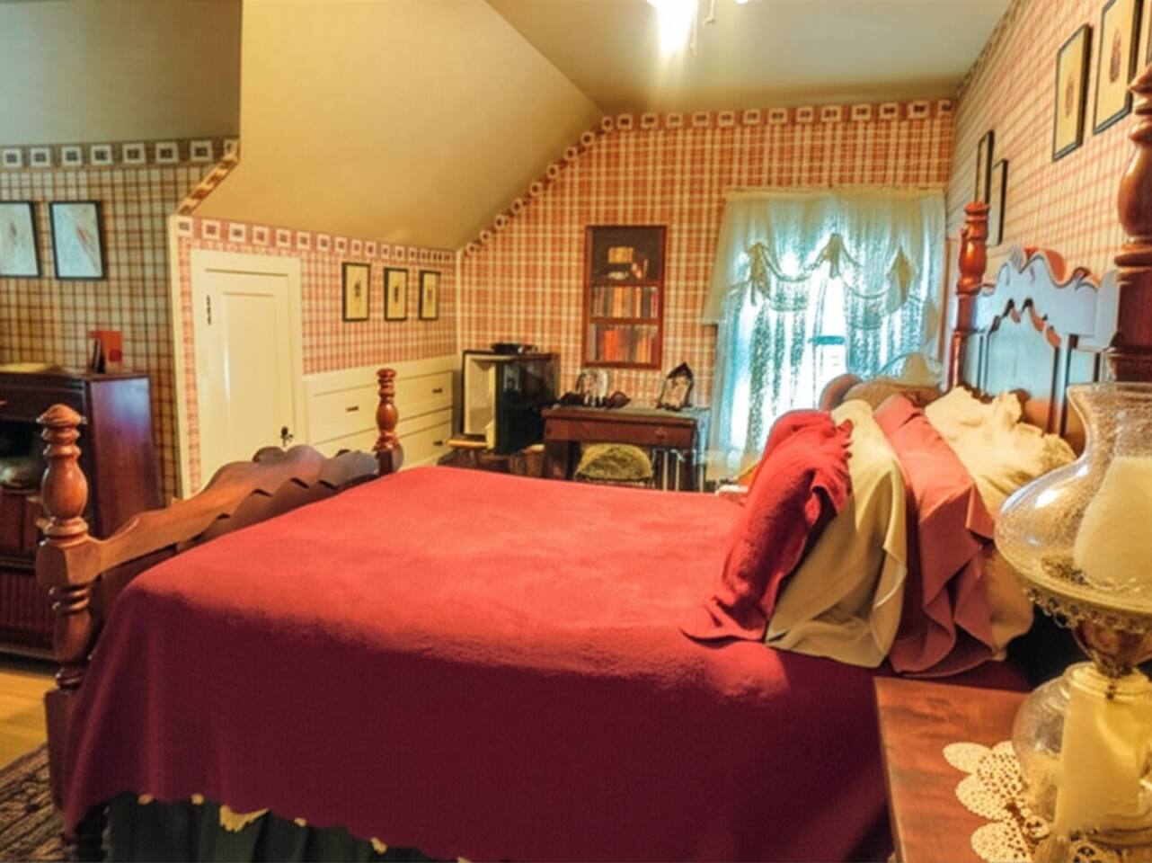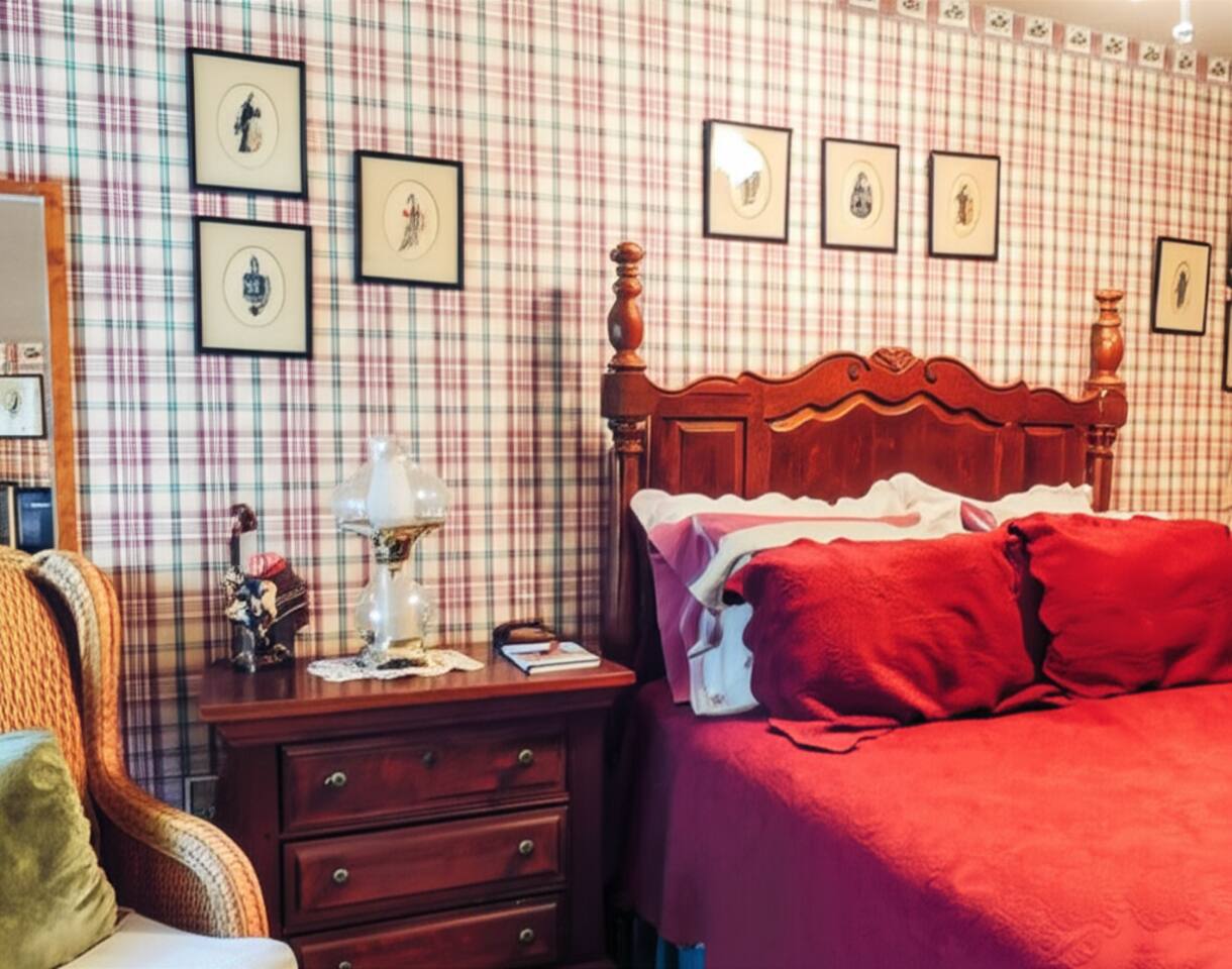 ❉❉❉ Romantic Manor Room #6 | Victorian Charm with Modern Comforts - Forest & Creek Views From the moment you arrive, you'll feel transported by the warmth of deep burgundy and cream hues, lace curtains, and the soft light filtering through the trees. Whether you're soaking in the clawfoot tub, curling up with a vintage book, or enjoying the quiet of the countryside, this room is designed for relaxation, romance, and reflection. Book your stay at Room #6 and experience historic charm!