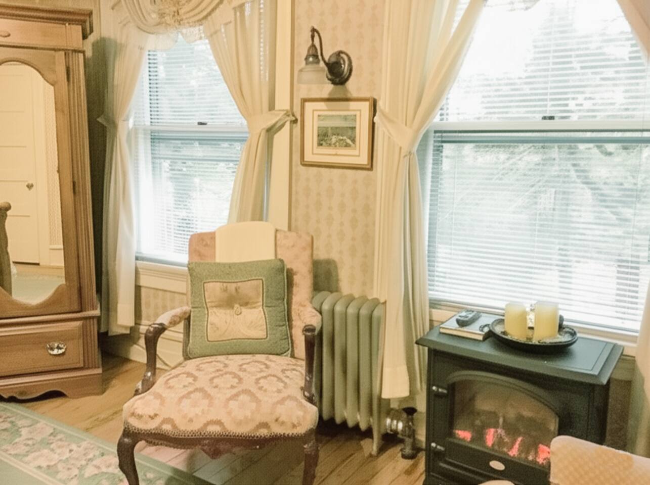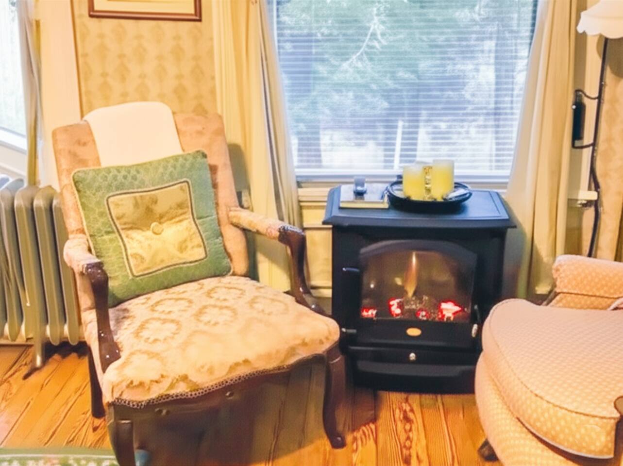 During your stay in Room #2 at the Manor House, you'll have exclusive, private access to your beautifully appointed bedroom and ensuite bathroom. ➽ Spend time in your private sitting area, featuring comfortable wing chairs and views of the Brodhead Creek. ➽ Enjoy the warmth and atmosphere of your freestanding indoor fireplace, perfect for relaxing evenings. ➽ Make use of in-room amenities, including a mini fridge, flat-screen TV, and ample storage space. ➽ Guests have free parking on the premises, making it simple to explore the surrounding area. Please note that while Room #2 is located within the Manor House, this listing includes private access only to your room and bathroom. Shared areas of the Manor House are unavailable during your stay, ensuring a peaceful and uninterrupted retreat.
